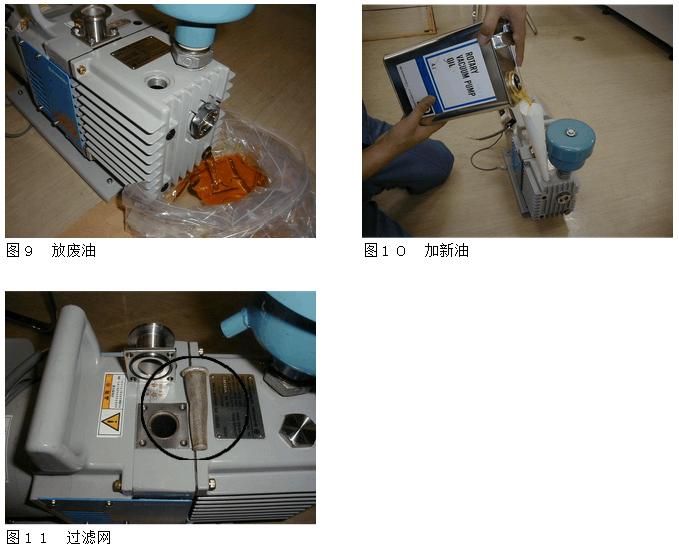 7.把真空泵上方加油的螺絲擰開,用干凈無水的燒杯(或用干凈的紙代替漏斗)把新的油 加到真空泵里,加到真空泵紅色油標(biāo)靠上側(cè)(紅色油標(biāo)的上2/3處較好)(圖10) 8.真空泵吸氣口的濾網(wǎng)的清掃,可以用分析純酒精泡濾網(wǎng),去掉油污。(圖11) 9.真空泵外面粉塵認(rèn)真清掃干凈,旋轉(zhuǎn)軸用吸塵器吸干凈。 10.把真空泵放入MXF內(nèi)原位置。 11.把P45,P5插頭查好。