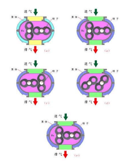 如圖為羅茨泵轉(zhuǎn)子由0°轉(zhuǎn)到180°的抽氣過程。在0°位置時(shí)(圖中a),下轉(zhuǎn)子從泵入口封入v0體積的氣體。當(dāng)轉(zhuǎn)到45°位置時(shí)(圖中b),該腔與排氣口相通。由于排氣側(cè)壓強(qiáng)較高,引起一部分氣體返沖過來。當(dāng)轉(zhuǎn)到90°位置時(shí)(圖中c),下轉(zhuǎn)子封入的氣體,連同返沖的氣體一起排向泵外。這時(shí),上轉(zhuǎn)子也從泵入口封入v0體積的氣體。當(dāng)轉(zhuǎn)子繼續(xù)轉(zhuǎn)到135°時(shí)(圖中d),上轉(zhuǎn)子封入的氣體與排氣口相通,重復(fù)上述過程。180°(圖e)位置和0°位置是一樣的。轉(zhuǎn)子主軸旋轉(zhuǎn)一周共排出四個(gè)v0體積的氣體。