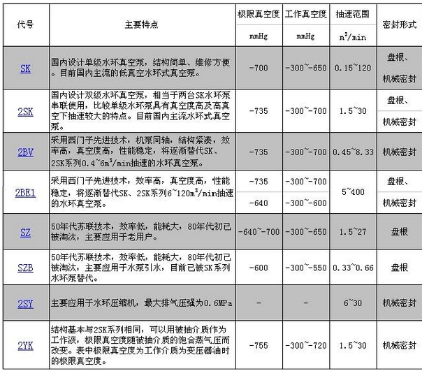 面對各種型式的水環式真空泵及壓縮機,我們特將其各自特點收集如下,以利于用戶選型